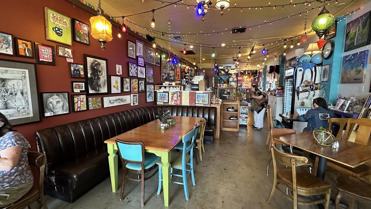 Inside, the walls are adorned with artwork from over a hundred local artists, giving the space an eclectic and creative vibe that serves as both inspiration and conversation starter. The lighting—softly strung around the plants and seating areas—adds warmth without feeling cramped, although the café does tend to fill up quickly during peak hours, especially midday and weekend mornings.